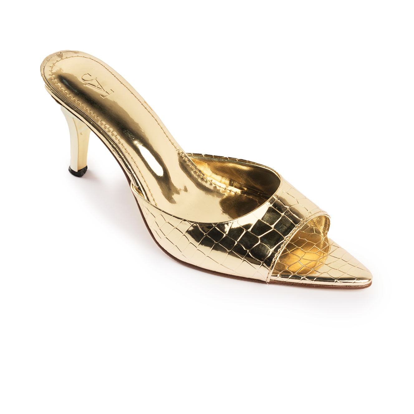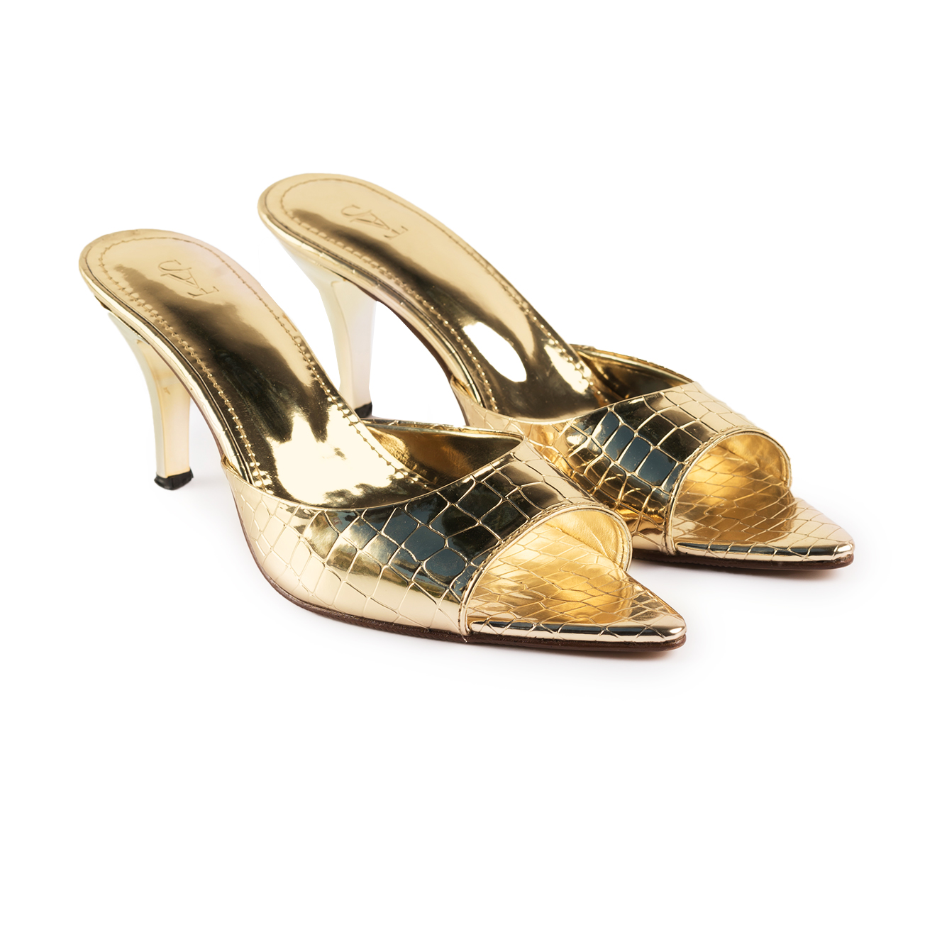 Sleek point-toe gold stilettos with minimalist strap.